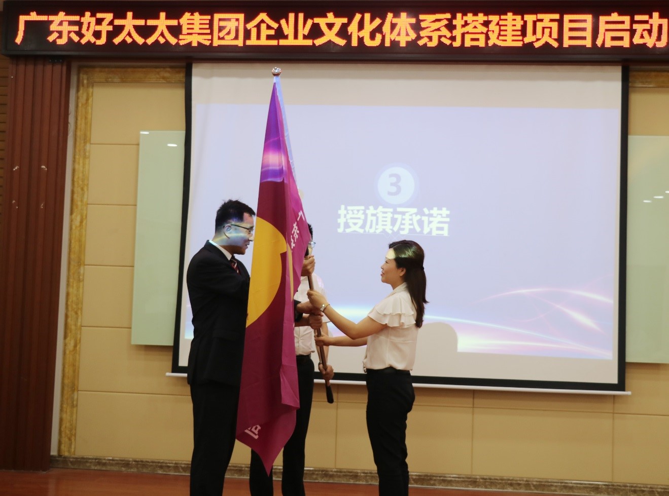 伴随着庄严神圣的音乐,人力资源中心陈总和中大咨询的蔡总从王总手中接过司旗,并郑重许下承诺。在场的全体领导也在承诺书上签下自己的名字。授旗、承诺这不仅是一面旗子、一张承诺书,背后意味着承担的使命和责任。