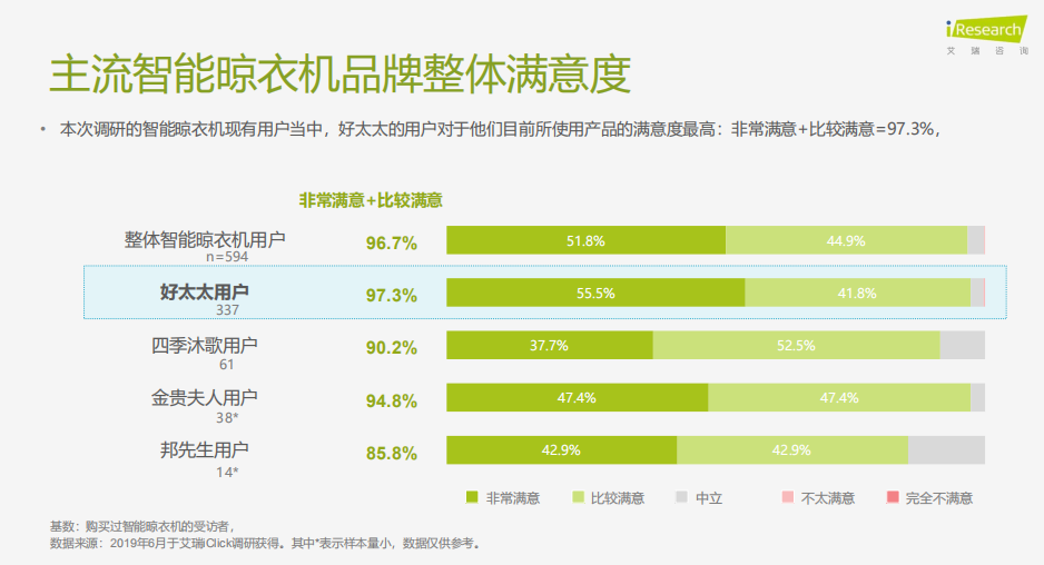 经过深入调研后,艾瑞在晒衣节当天发布《国货当智强——家居晾晒智能化趋势洞察报告》,报告显示,消费者普遍认同的国货家居代表品牌有乐鱼、水星家纺、欧派、富安娜与九牧等。此外,乐鱼在主流晾衣机品牌的整体满意度是最高的,并且在智能功能、材质做工或者安装售后等任何一个维度上看,乐鱼都是当仁不让的行业第一名。