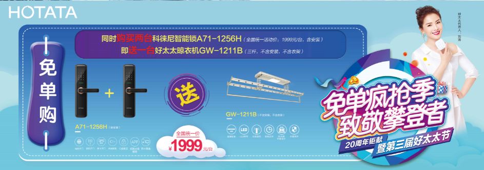 *免单购:同时购买两台科徕尼智能锁A71-1256H(全国统一活动价:1999元/台,含安装),即送一台好博晾衣机GW-1211B(三杆,不含安装,不含衣架)