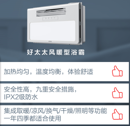 而乐鱼智能浴霸,加热均匀,温度均衡,体验舒适;安全性高,九重安全措施,IPX2级防水;集取暖、凉风、换气、干燥、照明等功能于一体,一年四季都适合使用!