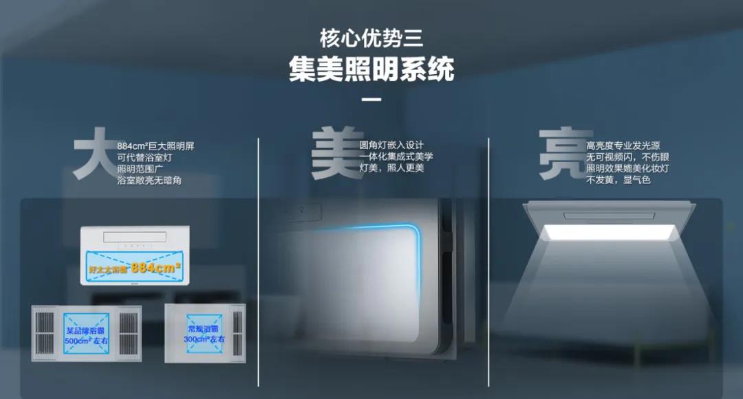 浴室灯也不将就!乐鱼智能浴霸,采用884平方厘米巨大照明屏,照明范围广,不伤眼,高亮度高显色,媲美化妆灯,更显气色人更美!