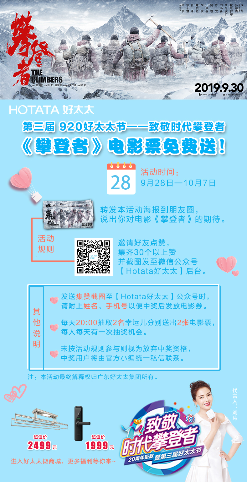 微信关注官方公众号【Hotata乐鱼】,回复“电影票”,即获得电影《攀登者》送票攻略。