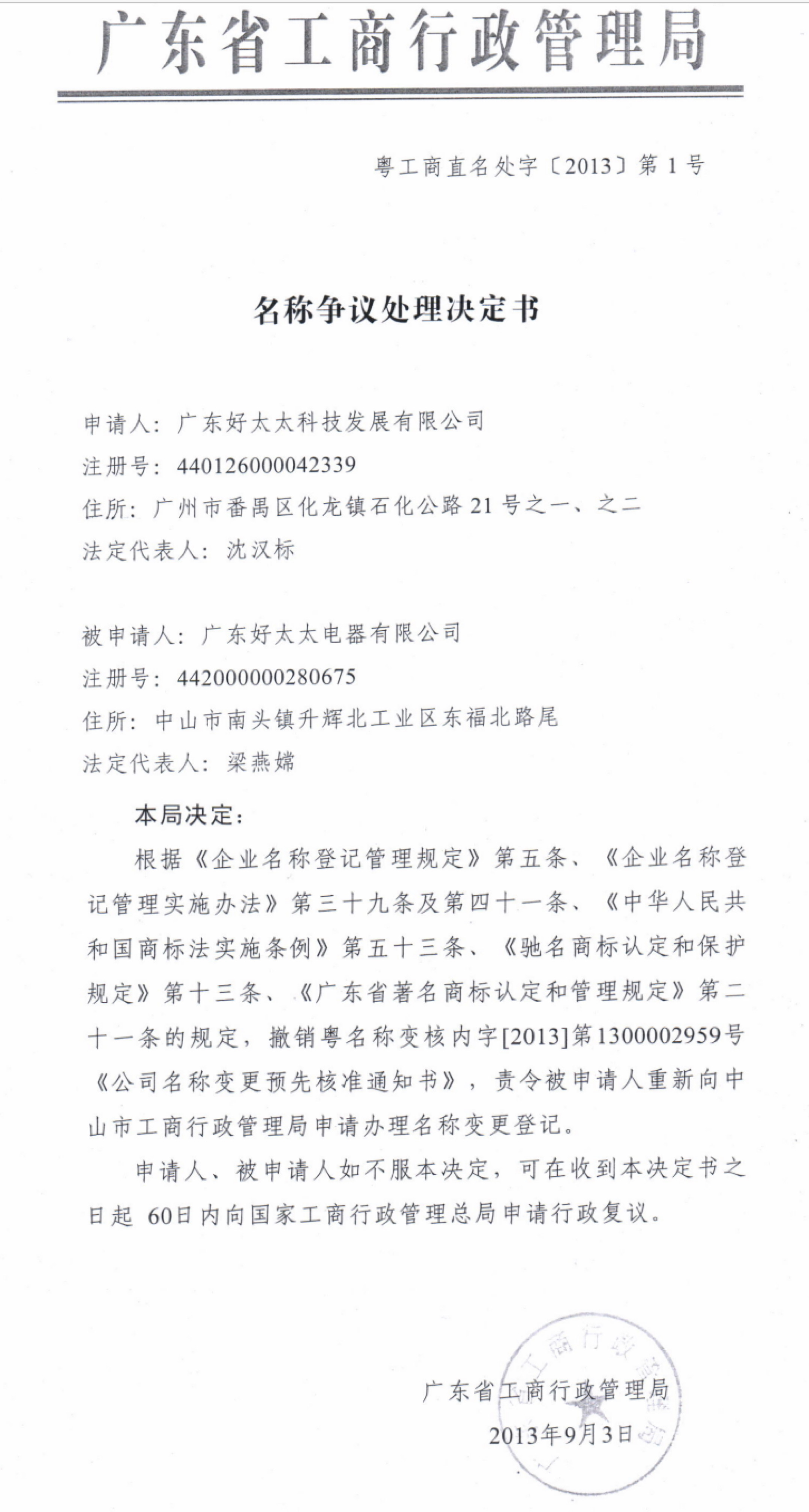 2013年7月24日,老健明通过让其妻子梁燕嫦担任法定代表人,成立乐鱼电器公司,股东为佛山凯达能公司和乐鱼电器集团有限公司。凯达能公司以设立新主体的形式继续使用“乐鱼”字号,并且十数年不间断地在第11 类抽油烟机、燃气灶商品上申请“乐鱼”、“Haotaitai乐鱼”商标而被商标局一一驳回。